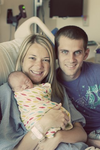 Nancy, my nurse, came in around 5 and said she wanted me to try and push so she could see how fast the head would come. I pushed once and she told me to stop because I still had one more hour and that head was coming fast. I really liked this way because I basically just let my body get to that point by itself, so when the time came everything happened really easily. Dr. Froerer came in around 6 took a little peek and said that it was time. Every time I had a contraction he would tell me to push 3 times for 10 seconds each. It wasn't hard at all. I was so nervous that the baby was coming that time seemed to go by really really fast. My baby was born at 6:55 am. Only about four and a half hours after we got to the hospital. When they laid him on my chest I was seriously surprised that he was so big. I don't know if I ever really understood what was inside of me. How did all 7 pounds 7 ounces and 21 inches of him fit inside of me? He cried and I have really never ever heard a cuter cry. I know all parents must think that, but everyone who heard him cry after that commented on that cute little squeak! Cory cut the umbilical cord, the gave him a quick clean up and then gave him back to me. He snuggled right up to me, and I was in shock! I was told HORROR stories! I was told that I could and probably would be in labor for days! And now, in a blink of an eye it was over!